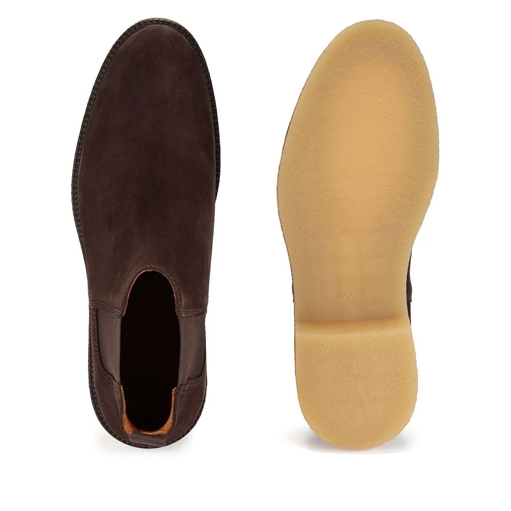 Modern Chelsea boots made in Portugal by BOSS. Set on a rubber outsole with a leather welt, these ankle boots are crafted in soft suede and trimmed with tonal elasticated side panels. Leather lining and an embossed logo complete this contemporary pair.