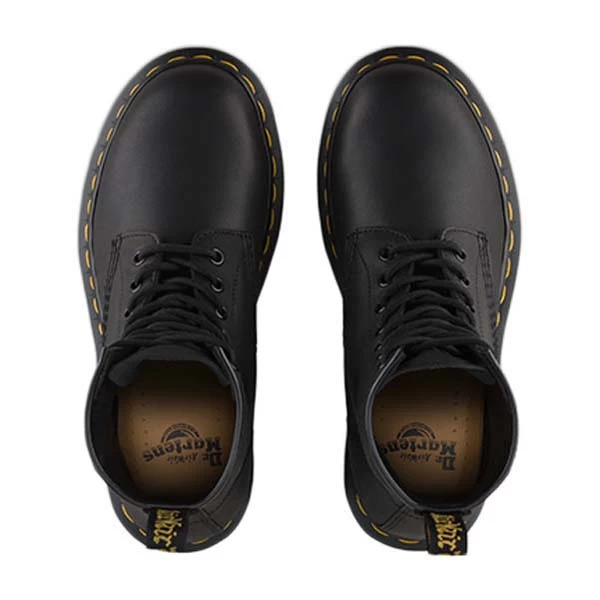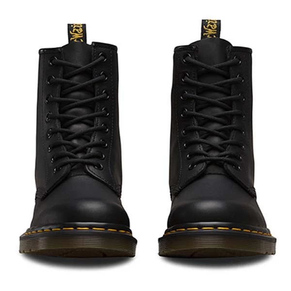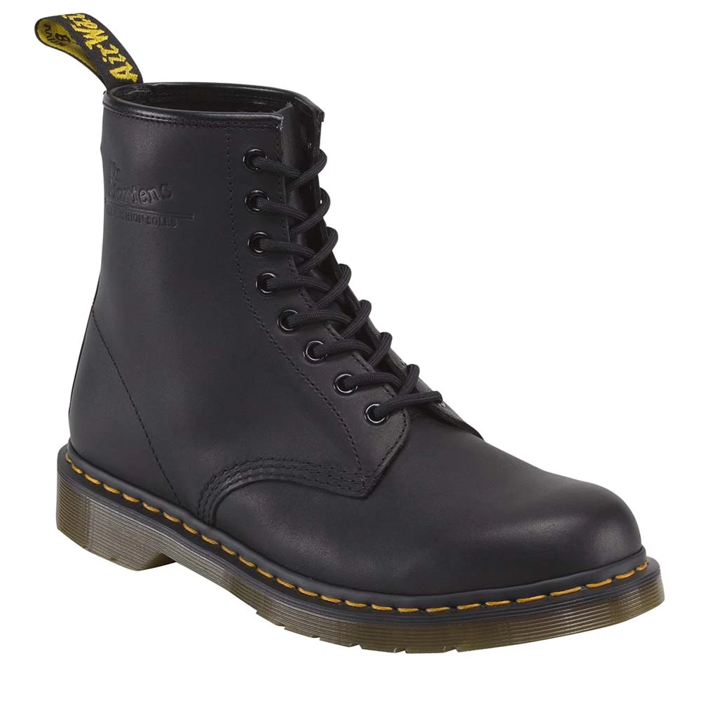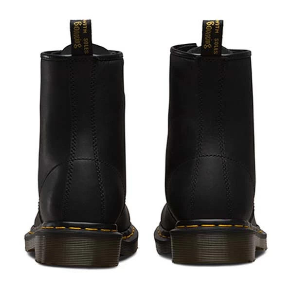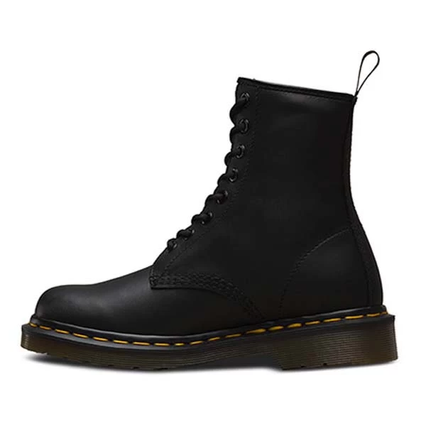 The 8-eye 1460 Greasy Booty comes in a black PU coated leather with a matte greasy effect. Over the past few years, these boots have become firm favorites. The combination of reinvented styling and the rugged, yet refined Ben outsole, allows these offerings to mix premium comfort alongside sleek styling. Classic Heel loop. Offered in a unisex size range to include both mens and womens sizes. Made with Goodyear welt, the upper and sole are heat-sealed and sewn together, not merely glued, like many footwear constructions. This, together with our Z welt-stitch and heat-sealing process, makes it unique. Dr. Martens have an air-cushioned sole, are oil and fat resistant and offer good abrasion and slip resistance.